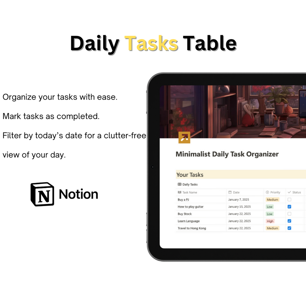 Simplify your productivity and take charge of your day with the Minimalist Daily Task Organizer—a sleek, easy-to-use Notion template designed for anyone who wants to focus on what matters most. Perfect for busy professionals, students, or anyone seeking a streamlined approach to daily organization.