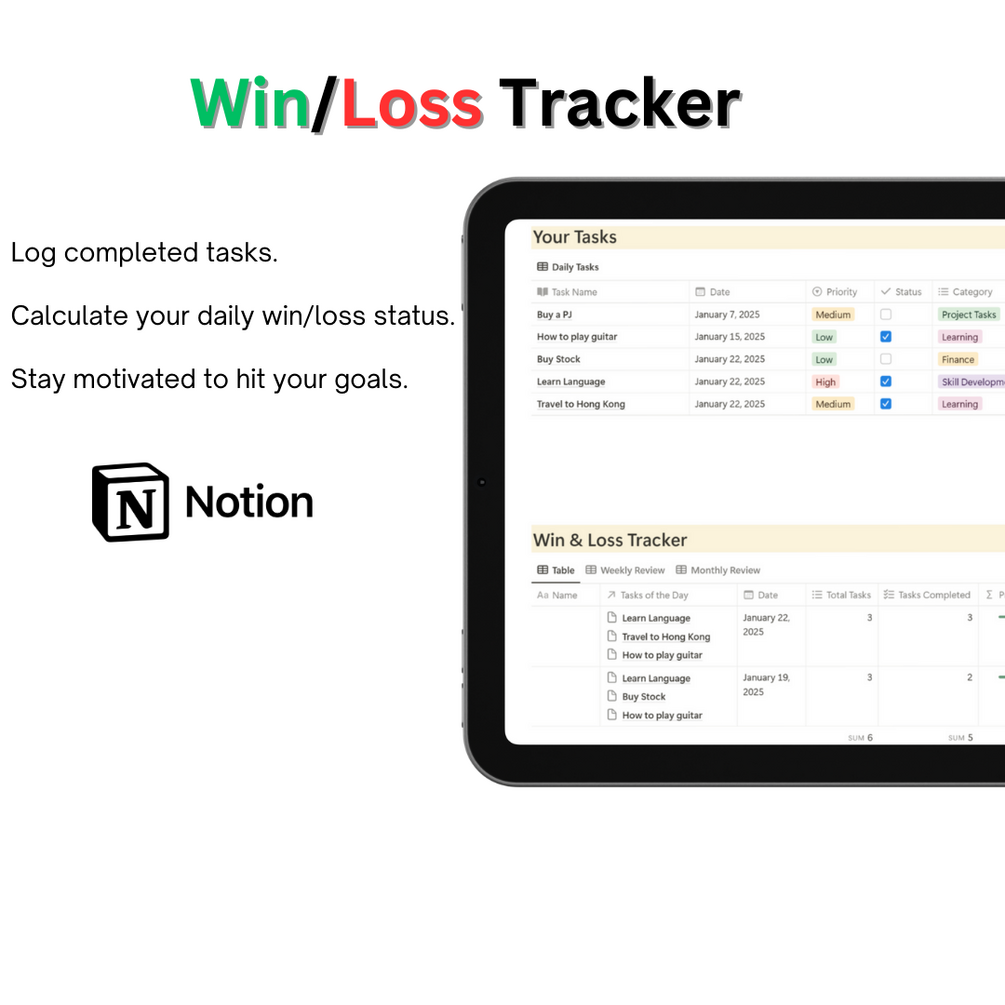 - Win/Loss TrackerLog your daily progress with a simple tracker.Record completed tasks, and total tasks, and determine if your day was a "Win" or "Loss."